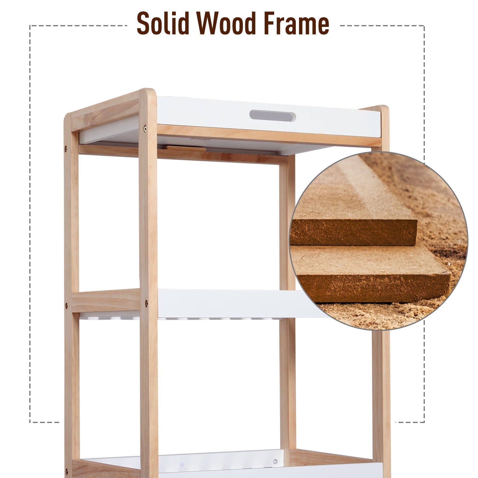 - MDF shelves for easy cleaning with a pine wood frame for durability