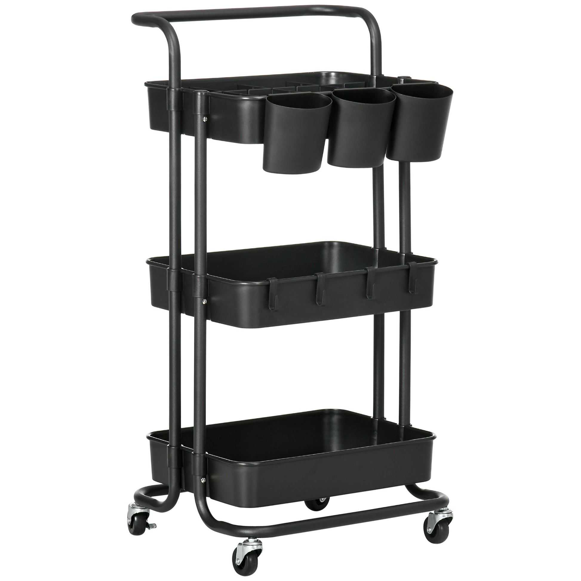 This HOMCOM rolling cart offers on-the-go storage, for whatever you want. Three-tier design, with three hanging boxes and four hooks give you plenty of holding room. A steel frame for a reliably strong structure, fitted with four wheels and a handle to move around easily; two wheels can be locked in place. Top tray is sectioned into 12 parts for better organisation. A kitchen storage trolley, drinks trolley - or how about keeping all beauty essentials together? The choice is yours.